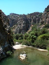 The gorge that forms the river "megapotamos" ends at the Libyan Sea creating a small lagoon at its mouth. This lagoon, which the locals call "Lake" (limni , Gr:Λίμνη), is surrounded by palm trees and rich vegetation and is one of the most attractive places in Crete. In the past it used to be the ideal place for camping and naturalism. The sea is clean with a dazzling range of green and blue colors and the beach has fine white sand.